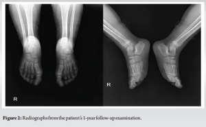 A short leg splint was applied to her more affected right lower extremity for a period of 3 weeks. Regular follow-up appointments at the Orthopedics and Traumatology outpatient clinic were advised every week to ensure comprehensive care and monitoring of her progress. The patient was instructed to avoid weight-bearing activities and to take ibuprofen at a dosage of 10 mg/kg as needed for pain relief. At the 1-month follow-up, the patient confidently reported a pain level of only 1–2 on the VAS on her right side, with no pain at all on the left side. Additionally, the family mentioned that the patient was significantly better at mobilizing compared to 1 month prior, demonstrating clear improvement in her overall condition. In addition, at the 1st year follow-up, the patient’s complaints had completely regressed. Improvement was also detected on the follow-up radiograph (Fig. 2).