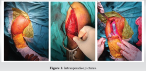 All patients were operated with the standard deltopectoral approach. All patients were positioned supine on the operating table with a sandbag placed between the spine and the medial border of the scapula, pushing the affected side forward, thereby opening the front of the joint. The head end of the table was raised to an angle of 30–45° to minimize bleeding and facilitate blood drainage away from the surgical area. Across the deltopectoral approach, fragments were reduced and temporarily fixed with k wires. After appropriate reduction, the plate was placed at least 8 mm inferior to the greater tuberosity. Then the plate was aligned and fixed with multiple locking or cortical screws. The humeral head is fixed with only cancellous locking screw and infer medial screw calcar screws is important and mandatory for preventing the secondary loss of reduction [Fig. 1]. The final position is checked with the use of an image intensifier in multiple planes. The shoulder is then checked for range of movements and the stability of fixation. None of our patients were required for bone grafting [6]. Intraoperative complications include Fracture of the shaft due to forceful manipulation, displacement of any undisplaced fractures, damage to the deltoid due to retraction, and damage of the axillary artery or nerve.