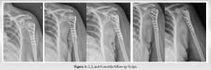 Post-operatively, the arm was immobilized using a shoulder immobilizer for all 20 patients. The time for commencement of shoulder physiotherapy was based on the stability of fixation, quality of bone, and compliance of the patient. Passive range of movement exercises, such as pendulums, passive forward elevation, and external rotation, were generally started on the 1st post-operative day, provided that a stable reduction was achieved. Active range of movements of the elbow, wrist, and hand was also started on the 1st post-operative day. Early passive assisted exercises, active exercises were started at approximately 6 weeks post-operatively and strengthening or resistance exercises started at 10–12 weeks post-operatively. Post-operative X-rays were taken after 24 h of surgery to check the fracture alignment, reduction, and fixation [Fig. 2]. Routine follow-up radiographs were taken after 4 weeks, 3 months, 6 months and 12 months post-operatively to evaluate the features of union, such as disappearance of fracture line, inner column continuity, trabecular continuity, calcar screw status, maintenance of neck shaft angle, and plate related complications, such as screw penetration, screw cut out, avascular necrosis, and implant loosening [Fig. 3,4]. Common post-operative complications are restricted movements associated with pain, operative site infection, fixation failure, avascular necrosis of the head, and sometimes late rupture of the cuff muscles [7].