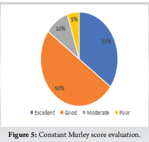 All patients had closed proximal humerus fractures and were classified into Neer’s 2-part, 3-part, and 4-part fractures. The common type of fracture observed in our series was 2-part fracture, accounting for five of twenty patients (25%), along with 3-part fracture, accounting for ten of twenty patients (50%).4-part fracture accounted for five of twenty patients (25%) (Table 2). All patients were evaluated using Constant Murley score and radiographs taken for the proximal part of the humerus. Out of 20 patients, 7 patients had excellent Constant Murley scores, 10 had good scores, 2 had moderate scores, and 1 had a poor outcome score. Mean Constant Murley score is 81.26 (range 60–94 points). Mean constant score for Neer’s 2-part fracture was 85.2 (range 80–94), 3-part fracture was 77.8 (range 62–92), and 4-part fracture was 80.8 (range 60–92). The mean constant score for middle age group (18–40) was 86.4, for old age group (41–60) was 80, and for very old age group (>60) was 78.44 [Fig. 5].