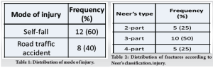 The study consisted of 10 female and 10 male patients. Four were in the age group of 25–35 (20%), two in the age group of 36–45 (10%), three in the age group of 46–55 (15%), seven in the age group of 56–65 (35%), and four in the age group of 66–75 (20%). Twelve patients (60%) presenting to the hospital had self-fall from standing height as the reason for their proximal humerus fractures. The remaining 8 patients (40%) developed fractures due to road traffic accidents (RTA) (Table 1).