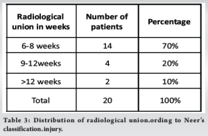 Nineteen out of our twenty patients had fracture union around 9 weeks of follow-up. The average time seen for radiological union of the fracture was 8.4 weeks (6–14 weeks) (Table 3).
