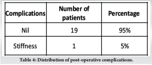 During follow-up, only one patient had post-operative stiffness (5%) (Table 4). There were no incidences of non-union, malunion, implant failure, screw cut-out, neurovascular injury, varus collapse or osteonecrosis of the proximal humeral head.