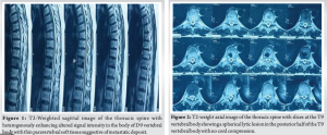 We present the case of a 51-year-old female with acute-onset severe upper back pain for 3 months before presentation. She was a known case of adenocarcinoma of the breast, for which she underwent a surgery in 2014 and has been reportedly cancer free since then. She was on chemotherapy of tamoxifen till June 2022. Pain was localized to the upper back, which worsened in the morning. Pain was without any radiation or mechanical symptoms. She felt partial relief on medication and after walking a few steps. There was no history of trauma and no previous history of such episodes. Current medications included only a daily oral dose of thyroxine supplementation. The patient had tenderness to deep palpation over the dorsolumbar region. There was no significant neurology or bowel/bladder involvement. Laboratory assessment revealed no significant findings including a negative M band. Magnetic resonance imaging (MRI) of the lesion was performed (Fig. 1 and 2).