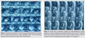 Additional gadolinium contrast (Fig. 3 and 4) was then done, which showed a focal lytic lesion in the T9 VB. This lesion was hypointense on T1- and T2-weighted images and showed heterogeneous enhancement on gadolinium contrast images. A metastatic deposit was suspected. A positron emission tomography–computed tomography (PET-CT) was then performed (Fig. 5 and 6), which reported focal 15F-FDG uptake in the body of T9 vertebrae. Differential of this nodule was inflammatory, infective, or metastatic.