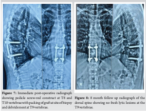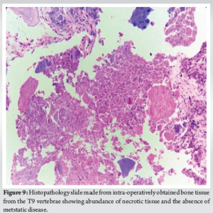 A CT-guided biopsy yielded no organism growth, and histopathology sample was reported as necrotic bone with normal marrow elements, with immunohistochemistry negative for tumor markers. At the end of this thorough investigation protocol, the primary surgeon was unconvinced with the CT-guided biopsy report suspecting inadequate sampling. The patient underwent an open debridement and screw-rod fixation at D8 and D10 with graft placement at hollow debridement site (Fig. 7). Sample of size 2 cm3 collected during the surgery was sent for histopathology (Fig. 8 and 9) which reported it to be necrotic bone with regenerating woven bone intervened by fibroblastic reaction and there seemed to be no evidence of tuberculosis or metastasis.