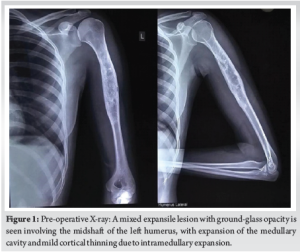 Keywords: Fibrous dysplasia, pathological fracture, fungal growth, humerus, intramedullary, bone curettage, grafting.