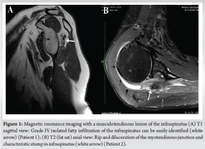- 3.Lunn JV, Castellanos-Rosas J, Tavernier T, Barthelemy R, Walch G. A novel lesion of the infraspinatus characterized by musculotendinous disruption, edema, and late fatty infiltration. J Shoulder Elbow Surg 2008;17:546-53. [Google Scholar]
