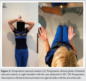 Both patients wore a 45° ER1 sling for 6 weeks post-operatively. This was followed by a physiotherapy regimen comprising 4 weeks of passive and pendular mobilization, and subsequently, 8 weeks of progressive active shoulder reinforcement. They were advised to avoid heavy or manual labor until 6 months post-operatively.