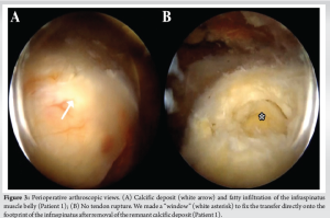 Patient 2: Arthroscopic examination of the glenohumeral joint revealed glenohumeral arthritis, but the cartilage was intact. There were no significant lesions in the tendinous portion of the infraspinatus. However, significant fatty infiltration of the infraspinatus muscle belly was observed, along with a calcific deposit at the site of the musculotendinous junction lesion. The other remaining rotator cuffs were intact.