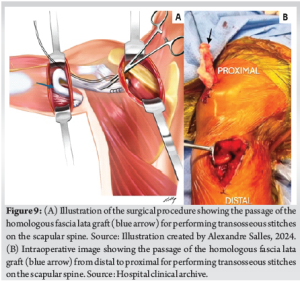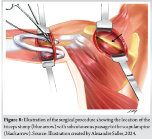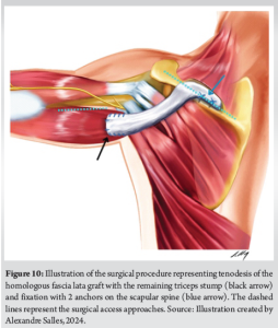 For the subcutaneous passage of the graft, another incision was made over the spine of the scapula, dissection by layers, and isolation of the spine. A tunnel was created from the spine of the scapula towards the triceps. Transfer of the graft (Fig. 9a and b) and suturing on the spine of the scapula with two anchors (Fig. 10). The remainder of the graft was taken back to the triceps and sutured over it (Fig. 10). Significant improvement in the deformity of the arm was observed. The patient remained immobilized with a simple sling for 4 weeks.