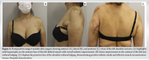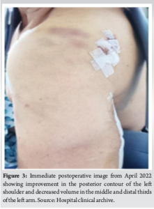 After these procedures, an improvement in esthetics was observed, absence of bulging on the posterior face of the left shoulder, better contour of the left arm, and slight visible hypotrophy on the anterior face of the left deltoid muscle (Fig. 5). The patient also showed clinical and functional improvement, with recovery of active elbow extension and was cleared to begin muscle strengthening.