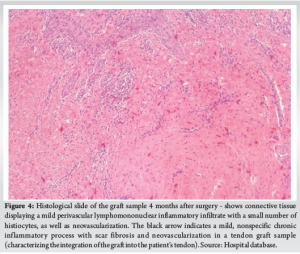 Four months after the surgery, the patient presented with a granuloma at the distal incision of the operative wound and underwent resection of it and removal of a sample of the tendon graft related to the granuloma, which was sent for anatomopathological evaluation. The connective tissue in the graft sample exhibited mild perivascular lymphomononuclear inflammatory infiltrate with a small number of histiocytes, in addition to neovascularization. This discrete nonspecific chronic inflammatory process with scar fibrosis and neovascularization characterized the integration of the graft into the patient’s tendon (Fig. 4).