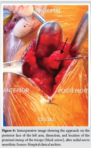 The patient was positioned in right lateral decubitus, and access was made on the posterior face of the left arm (Fig. 6), with dissection by layers and hemostasis. Neurólisis of the radial nerve, which was adhered to the BT. Dissection and release of the BT heads. Regarding the homologous fascia lata graft (Fig. 7), suturing was performed on the remaining triceps stump with polyester stitches size five (Fig. 8).