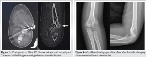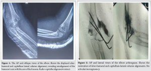 Under general anesthesia and in a supine position, closed reduction was done with longitudinal traction, mediolateral correction, and elbow flexion to stabilize the fracture. We did percutaneous pinning with two lateral 1.5 mm K-wires. We did arthrography by injecting Iohexol from the lateral aspect of the elbow. The arthrogram showed articular congruity (Fig. 2). Pins were bent, cut, left outside for easy removal, and immobilized at seventy degrees with a back slab. We did a post-operative CT to assess the fracture pattern and reduction. (Fig. 3).