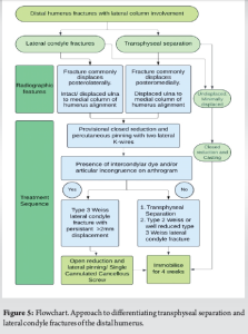 Conclusion: Transphyseal separation of the distal humerus can mimic lateral condyle fracture in children. Proper pre-operative radiographs and intraoperative arthrogram can avoid unnecessary open reduction and complications. This article presents a flowchart to help make a better decision regarding management.