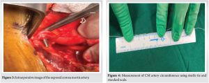 The measurement of the CM artery was conducted intraoperatively using a sterile surgical tie. After looping the tie around the artery, its length was measured using a standard graduated ruler (Fig. 4) while ensuring the vessel was not compressed or stretched. This unconventional yet practical method allowed immediate and real-time vascular assessment, which is especially valuable in emergency surgical settings lacking advanced imaging support. The vessel’s diameter was derived from its circumference using the mathematical relation: diameter = Circumference/π (16 mm/3.142≈5.09 mm). This technique, though simplistic, provided a reliable estimate in the context of operative decision-making. This measurement exceeds the commonly reported 2–4 mm diameter in most anatomical studies.