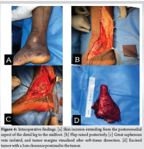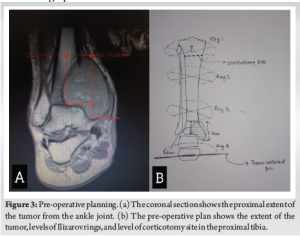 A 36-year-old male presented after noticing a gradually increasing swelling over his right ankle for the past 3 months. It was associated with a dull and diffuse type of pain which was aggravated with weight bearing. He denied a history of any previous trauma. He had noticed significant weight loss in the past 6 months. On clinical examination, there was a localized swelling of size 5 × 3 cm over the medial aspect of the ankle, which was tender, immobile, with ill-defined edges, and was bony hard in consistency. The range of movements in the ankle was minimally restricted in comparison with the contralateral side. There was no neurovascular deficit in the affected limb. Plain radiographs of the affected limb were done and showed an ill-defined, radiolucent, expansile lesion in the medial aspect of the distal end of the tibia, with a posteromedial cortical breach and a narrow zone of transition (Fig. 1a and b). Magnetic resonance imaging of the affected limb was performed and showed a T1 hypointense lesion of size 6.1 × 4.7 × 7.3 cm in the epi-metaphyseal region of the distal tibia (Fig. 2a), with multiple cystic areas and fluid levels (Fig. 2b) – suggestive of giant cell tumor of the distal tibia with secondary aneurysmal bone cyst formation. Biopsy was performed from the lesion, under ultrasound guidance, and showed osteoclast-like giant cells and neoplastic cells with ill-defined borders and eosinophilic cytoplasm, suggestive of giant cell tumor. Based on the radiographic appearance, the tumor was classified according to the Campanacci grading as Type III owing to the presence of ill-defined margins and a cortical breakthrough. After a thorough review of the literature and a multidisciplinary discussion with the surgical oncology team in assessing all the possible options of intervention, pre-operative planning was done, and the patient underwent wide excision of the tumor and was planned for bone transport with an Ilizarov ring fixator (Fig. 3a and b). The patient was positioned supine on the operating table with a primary surgeon on the right side and an image intensifier on the contralateral side. The skin incision was made over the posteromedial aspect, extending from the distal third of the leg to mid-foot (Fig. 4a). The flap was raised posteriorly (Fig. 4b), posterior compartment was dissected, and the great saphenous vein was isolated along its course. Tumor margins were identified, and tibia was osteotomized, giving a 3 cm clearance proximal to the tumor (Fig. 4c). Ligaments around the ankle were cut, and the distal end of the tumor was visualized. The tumor, along with the encased tibialis posterior, was removed in toto (Fig. 4d) and was sent for histopathological examination. A thorough wash was given, and the wound was closed. Three equidistant Ilizarov rings were fixed around the tibia proximal to the osteotomy site using tensioned wires and were interconnected with threaded rods. A half ring was fixed around the midfoot with tensioned wires and connected to the proximal rings (Fig. 5). Proximal tibial corticotomy was done at a level between the proximal and middle rings. Postoperatively, distraction was started from day 7, at the rate of 1mm/day, and was continued for a period of 90 days, resulting in a distraction of 90 mm at the corticotomy site, thereby filling the defect in the distal tibia. Serial radiographs were done to look for consolidation of the regenerate at distraction site and docking of the stump over the talus (Fig. 6a-c). 90 days later, once docking was complete (Fig. 6d), distraction was stopped, and the frame was retained for a period of 180 days, allowing for consolidation of regenerate at the distraction site. Once clinical and radiological signs of union were confirmed at the distraction site, acute docking was performed, and fusion at the ankle was done. The Ilizarov frame was then retained for a period of 6 months. After 6 months, once complete union was noticed at the docking site, the frame was (Fig. 6e and f). The patient was then gradually made to weight bear partially with a walker frame for a period of 4 weeks. Later he was allowed full weight-bearing walking, initially with a walker frame for 2 weeks, followed by an elbow crutch for 2 weeks and unassisted subsequently. He was last followed up 2½ years postoperatively and showed no clinical or radiological signs of recurrence. He was able to walk unassisted with a plantigrade foot. Dorsiflexion and plantarflexion at the ankle were not possible. Minimal passive inversion and eversion movements at the subtalar joint were preserved.