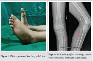 Case Report: A 9-year-old male child with acute onset of foot drop leading to high stepping gait. Clinical examination revealed complete loss of left ankle dorsiflexion with no sensory loss. In comparison to other right knee, there was a smooth rounded prominence felt over the fibular head and neck. Radiological and electromyography investigations suggested sessile bony swelling possibly osteochondroma of fibular head denting on Common peroneal nerve (CPN). Early surgical intervention in the form of osteochondroma excision and neurolysis of the CPN offered complete recovery. We describe the case of a 9-year-old boy who had an osteochondroma of the fibular head resulting in common peroneal neuropathy and full foot drop. We go over the diagnosis, course of treatment, and body of research on nerve issues in paediatric children associated with osteochondroma.