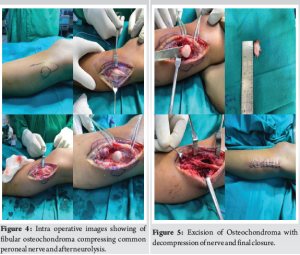 In the appendicular skeleton, osteochondroma is the most common benign developmental tumor. It is distinguished by an atypical, ectopic endochondral ossification surrounding the physis. Osteochondromas are either sessile or pedunculated and in 90% of the cases, they are solitary. The tumor is usually covered by a 1–3 mm cartilaginous cap, which is composed of hyaline cartilage, without cellular atypia [4]. The anatomical course of the CPN and its increased number of fascicles in (the fibular head and neck) area make the nerve vulnerable to any sort of injury. Although injury secondary to a fracture, iatrogenic, or application of skeletal traction or a tight cast are the major causes of peroneal palsy, non-traumatic lesions can to cause peroneal nerve neuropathy and include idiopathic peroneal palsy, intrinsic and extrinsic nerve tumours, extra neural compression by a soft tissue tumour, osseous mass, synovial cyst and ganglion cyst, etc. [4,5]. Osteochondroma is usually asymptomatic and detected as an incidental finding on radiography. It is considered the most common of all bone tumors. Complications related to the tumor are directly correlated by size and site also it can be intrinsic, extrinsic, or hav ing a mechanical origin.