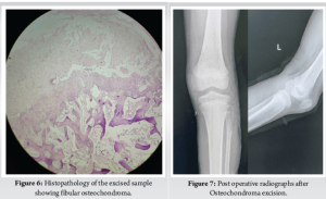 evidence of any malignant transformation. Post operative x-rays revealed the removal of the osteochondroma and loss of the bony contour which could be the possible reason for compression of CPN (Fig. 7). The patient had an uneventful surgery and postoperative rehabilitation protocol initiated along with foot drop orthosis. Patient eventually gained full power 5 months after the procedure and was able to perform the activities of daily living. After 2 years of follow up, he has full functional and neurological recovery.
