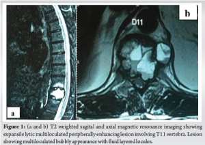 X-ray evaluation showed a pathological fracture of the T11 vertebra. Magnetic resonance imaging (MRI) dorsal spine showed expansile lytic multiloculated peripherally enhancing ill-defined lesion with a wide zone of transition replacing the entire normal marrow of the T11 vertebral body with grade II to thecal sac indentation, mild extramedullary thoracic cord compression with subtle cord edema. The lesion showed a multiloculated bubbly appearance with fluid-layered locules suggesting a possibility of ABC (Fig. 1). Differential diagnoses include Giant cell tumor, simple bone cyst, osteoblastoma, telangiectatic osteosarcoma, metastases, and plasmacytoma.