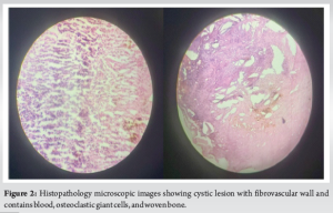 Posterior decompression, posterior stabilization, and biopsy were done. Bilateral pedicle screws inserted at T9, T10, T12 and L1. T11 posterior decompression was done by left hemilaminectomy and biopsy taken from T11 vertebra. The histopathology (HPE) report was consistent with ABC (Fig. 2).