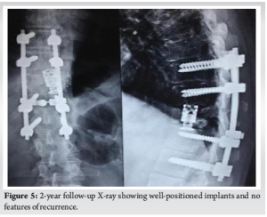 T11 corpectomy, tumor excision, and reconstruction with an expandable cage. Done 1 week after the first. Left lower thoracotomy. The 9th rib was exposed subperiosteally and excised. Pleura incised and the thoracic cavity entered. T11 was identified under c-arm guidance. ABC identified and removed in piecemeal. T11 corpectomy was done under the operating microscope. The defect is filled with local autograft and an expandable cage. Post-operative period, the patient was ambulated on day 1 with motor and sensory intact (Fig. 3, 4).