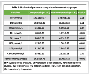 Materials and Methods: A cross-sectional analysis was conducted among 280 individuals diagnosed with osteoporosis and 182 without osteoporosis to assess the relationship between osteoporosis and serum levels of triglycerides, total cholesterol (TC), low-density lipoprotein (LDL), high-density lipoprotein (HDL), and homocysteine (HCY). Correlations between these biochemical indices and BMD were evaluated. CVD prevalence was compared between osteoporosis and non-osteoporosis groups, and receiver operating characteristic curve analysis was used to assess the predictive potential of BMD for CVD risk.
