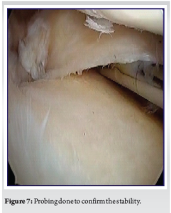 The procedure was performed under general or spinal anesthesia with the patient in a supine position. Standard arthroscopic portals were created to provide adequate visualization and access to the knee joint. Diagnostic arthroscopy was initially performed to assess the tear pattern and address any other knee pathologies, such as cartilage damage or associated ligament injuries. The MMPRT was confirmed through probing (Fig. 1), with the tear identified at the meniscus root attachment. Two relay sutures were passed using a suture-passing device (Fig. 2) to facilitate the repair of the root tear. A tunnel was drilled at the anatomical footprint of the posterior meniscus root, which was carefully identified during the arthroscopic procedure (Fig. 3) [11]. For fixation, the tunnel was made at the anatomical footprint, and the meniscus root was reattached using the fiber wire. Other concomitant meniscal tears were also addressed and fixed using appropriate fixation techniques. The final fixation was confirmed by probing (Fig. 4) to ensure that the root was securely attached to its anatomic footprint. The stability of the fixation was further validated through repeated probing (Fig. 5-7), confirming that the repair was stable and well-positioned [12].