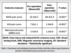 The primary outcomes included meniscal extrusion, which was measured using 3D MRI preoperatively and at 3 months post-surgery, and functional outcomes assessed through the knee injury and osteoarthritis outcome score (KOOS) and Visual Analog Scale (VAS) for pain. Secondary outcomes included complications such as infection, re-tear, and hardware failure, along with the ability to return to pre-injury activity levels.