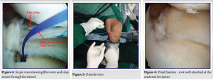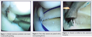 The procedure was performed under general or spinal anesthesia with the patient in a supine position. Standard arthroscopic portals were created to provide adequate visualization and access to the knee joint. Diagnostic arthroscopy was initially performed to assess the tear pattern and address any other knee pathologies, such as cartilage damage or associated ligament injuries. The MMPRT was confirmed through probing (Fig. 1), with the tear identified at the meniscus root attachment. Two relay sutures were passed using a suture-passing device (Fig. 2) to facilitate the repair of the root tear. A tunnel was drilled at the anatomical footprint of the posterior meniscus root, which was carefully identified during the arthroscopic procedure (Fig. 3) [11]. For fixation, the tunnel was made at the anatomical footprint, and the meniscus root was reattached using the fiber wire. Other concomitant meniscal tears were also addressed and fixed using appropriate fixation techniques. The final fixation was confirmed by probing (Fig. 4) to ensure that the root was securely attached to its anatomic footprint. The stability of the fixation was further validated through repeated probing (Fig. 5-7), confirming that the repair was stable and well-positioned [12].