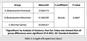 Results: Group A (Bupivacaine + Fentanyl) patients demonstrated significantly lower mean VAS pain scores at all time points compared to Group B (Bupivacaine + Ketorolac) and Group C (Normal Saline) (P < 0.05). The mean hospital stay was shortest in Group A (3.93 ± 0.74 days), with significant differences among all groups (P < 0.05). Total mean postoperative diclofenac consumption was lowest in Group A (387.5 ± 76.5 mg), and earlier ambulation was observed in Group A (2.5 ± 0.51 days) as compared to those in other groups (P < 0.05). The incidence of postoperative nausea and vomiting was also lowest in Group A (3.3%) compared to Groups B and C (P = 0.001).