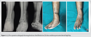 Here we report a case of 44-year-old male, a farmer by occupation, who presented to us with complaints of difficulty in weight bearing with ankle instability after he sustained a degloving injury over the lateral aspect of his left lower limb after being run over by a tractor 3 months back. At that time, he had a compound injury of the left ankle with distal fibula bone loss for which debridement of the necrotic tissue with an anterolateral thigh flap for wound coverage was done. On examination, the flap was present which was healed and accepted, the patient had significant mediolateral instability in the ankle and subtalar joint, varus opening, and antalgic gait with giving away sensation while walking. A plain radiograph of the ankle joint was ordered which showed complete loss of distal one-third of the fibula as shown in (Fig. 1). Basic blood investigations, chest radiograph, and pre-anesthetic work-up were performed. Pre-operative American Orthopaedic Foot and Ankle Society (AOFAS) score was 18/100 and the Foot and Ankle Disability Index (FADI) score was 26/104. Being a farmer, the patient wanted a stable, plantigrade, and pain-free limb for which arthroscopic ankle arthrodesis using an intramedullary tibio-talo-calcaneal nail was planned. In this case, the technique resulted in a stable, plantigrade, and pain-free limb, allowing for early mobilization without expected wound complications. At the 1-year post-operative follow-up as shown in the last figure, there was a notable improvement in clinical and functional outcomes, as evidenced by significant increases in AOFAS and FADI scores.