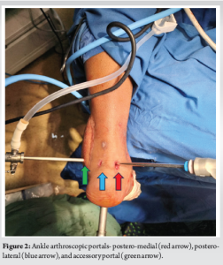 The arthroscopic TTC arthrodesis procedure began with the creation of posterolateral and posteromedial portals near the Achilles tendon. An additional accessory portal was also created as shown in (Fig. 2). A 4.5-mm scope was inserted, and the trocar was positioned for optimal visualization. The shaver was used to remove fatty tissue and joint capsule as shown in (Fig. 3). Key anatomical structures, including the posterior talar process, ankle joint, subtalar joint, and flexor hallucis longus tendon were identified, while scar tissue around the flexor hallucis longus tendon was cleared to create a safe working zone. Reaming started from the posterior to the anterior tibiotalar joint, followed by debridement of cartilage using burrs and curettes to expose the subchondral bone.