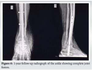 Conclusion: his case demonstrates that arthroscopic TTC nailing can be a safe and effective solution in complex clinical scenarios, offering advantages, such as reduced risk of post-operative infections, earlier rehabilitation, quicker wound healing, and satisfactory limb alignment. Despite promising results, further research and long-term studies are needed to validate this technique across broader patient populations and establish standardized surgical protocols.
