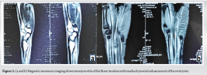 A 44-year-old male presented with complaints of pain and swelling over the volar aspect of his right wrist that had persisted for the past 2 months. The pain had started earlier than the swelling. The pain was insidious in onset and gradual in progression and was moderate-to-severe in intensity. It is aggravated with passive and active movements of the wrist and metacarpophalangeal (MCP) joints. The patient was unable to make a fist, resulting in weakness of grip, which led to difficulty in performing activities of daily living. There was no history of involvement of any other small or large joints of the body. There was no history of morning stiffness, fever, weight loss, or night cries. On examination, local temperature was raised, and diffuse tenderness was present over the swelling. The skin was normal and not adherent to underlying structures. A full range of extension was present in the MCP, proximal interphalangeal, and distal interphalangeal joints, but flexion of these movements was limited. Laboratory investigations revealed raised C-reactive protein and erythrocyte sedimentation rate, whereas the total leukocyte count remained within normal limits at 6800/µL. Rheumatoid factor and anti-cyclic citrullinated peptide (CCP) antibodies were negative. Basic imaging in the form of a plain X-ray of the wrist (Fig. 1) showed no abnormalities. Given the persistent swelling and non-specific laboratory findings, a high-resolution ultrasound of the wrist was performed. The ultrasound demonstrated a heterogeneous hypoechoic collection with thickening of the tendon sheath along the flexor pollicis longus (FPL) tendon, as well as flattening of the median nerve within the carpal tunnel, suggesting possible compressive tenosynovitis. Based on the above findings, a differential diagnosis of TB and GCT of the flexor sheath was made. The differential diagnosis of RA was not kept as there were no signs or symptoms suggestive of RA, and also the anti-CCP antibody and RA factors were negative. To further evaluate the extent and nature of the lesion, a contrast-enhanced magnetic resonance imaging (MRI) of the wrist was done. It showed tenosynovitis of the flexor tendons with marked synovial enhancement of the wrist joint, suggestive of an inflammatory aetiology (Fig. 2a and b). Based on the imaging and persistent symptoms, a surgical approach was planned for both diagnostic and therapeutic purposes. The patient underwent an open exploration of the wrist through a volar approach (Fig. 3).
