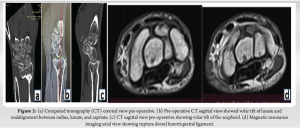 The medical record pertains to a 37-year-old male patient who initially sought medical attention at a different facility subsequent to a fall from a ladder on April 11, 2022. The patient’s instinctive reaction to the fall involved extending his hand to mitigate impact force, resulting in fractures at the distal ends of both radius and ulna [3]. To address these fractures, a closed reduction percutaneous pinning (CRPP) procedure and plaster of Paris (POP) for 6 weeks was performed with the objective of restoring anatomical integrity. Afterward, a physiotherapy program lasting for 6 months was initiated; however, regrettably, there was no observed improvement or advancement in joints’ range of motion (ROM) and grip strength [1]. Importantly, the initial examination following the CRPP procedure did not identify any carpal instability. Following this, evaluations conducted at our facility in January 2023 revealed clinical indications consistent with volar segmental intercalated instability, as seen in X-rays, magnetic resonance imaging and computed tomography scans Figs. 1d and 2a, b, c, d. Furthermore, limitations in ROM were apparent in wrist extension and flexion, as well as wrist supination and pronation as seen clinically presented in Fig. 1a, b, c of the clinical presentation [2,7].