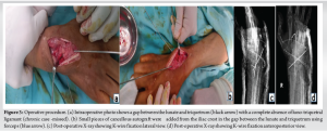 On January 12, 2023, an open reduction and internal fixation procedure was performed utilizing a dorsal wrist approach (Fig. 3a and b), which includes midline dorsal wrist incision over the carpal bone, between the 4th (EDC) and 5th (EIP) dorsal wrist extensor compartments, opening of joint capsule, exposure of lunate and triquetrum carpal bones. This surgical intervention aimed to achieve Luno-Triquetral Fusion, employing an Autologous cancellous bone graft sourced from the iliac crest (Fig. 3b). A K-wire was employed as a joystick to assist in the reduction of the scaphoid, and an additional wire was placed between the lunate and triquetrum before insertion of cancellous bone graft in the gap between lunate and triquetrum bones as seen in Fig. 3c and d. the 1st K-wire is kept between scaphoid and radius to maintain the position of scaphoid, closure of capsule and skin was done with interrupted sutures.
