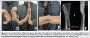 The medical record pertains to a 37-year-old male patient who initially sought medical attention at a different facility subsequent to a fall from a ladder on April 11, 2022. The patient’s instinctive reaction to the fall involved extending his hand to mitigate impact force, resulting in fractures at the distal ends of both radius and ulna [3]. To address these fractures, a closed reduction percutaneous pinning (CRPP) procedure and plaster of Paris (POP) for 6 weeks was performed with the objective of restoring anatomical integrity. Afterward, a physiotherapy program lasting for 6 months was initiated; however, regrettably, there was no observed improvement or advancement in joints’ range of motion (ROM) and grip strength [1]. Importantly, the initial examination following the CRPP procedure did not identify any carpal instability. Following this, evaluations conducted at our facility in January 2023 revealed clinical indications consistent with volar segmental intercalated instability, as seen in X-rays, magnetic resonance imaging and computed tomography scans Figs. 1d and 2a, b, c, d. Furthermore, limitations in ROM were apparent in wrist extension and flexion, as well as wrist supination and pronation as seen clinically presented in Fig. 1a, b, c of the clinical presentation [2,7].