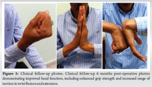 Alongside the X-ray images, presented in (Fig. 5 and 6), are photographs captured during a 6-month follow-up of the clinical case. These visuals showcase enhanced hand functionality, encompassing improved grip strength and expanded ROM in both wrist flexion and extension [3,6].