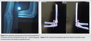 Patient in a supine position, in general anesthesia, by direct lateral approach, the capitellar fracture site was visualized, and the reduction was attained and stabilized with 2 K-wires (Fig. 3).