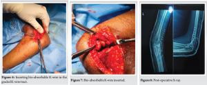 Inserting the bio-absorbable K-wire in the previous graded K-wire tract after placing it in a cylindrical sleeve, then malleting it in a blunt cut area so that it gets flattened and stays at the site (Fig. 6,7).