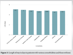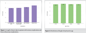 The LOS demonstrated heterogeneity with the presence of comorbidities and complications, age, and the need for transfusion. There was a moderate positive correlation between LOS and complications, and LOS and blood transfusion requirements. Patients with complications had significantly longer LOS (5.68 days) compared to those without (4.32 days). The LOS associated with different complications is outlined in Fig. 1. Patients requiring blood transfusions during their hospital stay had a longer LOS of 5.47 days compared to non-transfused patients (4.45 days). The LOS was relatively consistent across different age groups, with a slight increase in the 75–79 years age group (Fig. 2). Patients with CKD had the highest LOS (5.10 days), followed by those with PD (5.00 days) (Fig. 3).