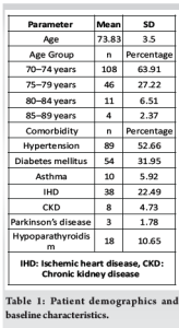 A total of 169 patients undergoing SBTKA were included in the study. The mean age of the study population was 73.83 years (SD = 3.50). Most patients (63.91%) were aged 70–74 years, followed by 27.22% in the 75–79 years category. A smaller proportion of patients were in the 80–84 years (6.51%) and 85–89 years (2.37%) age groups (Table 1). The study population had several comorbidities, with several patients presenting with multiple comorbidities (Table 1). The most prevalent comorbidity was hypertension, reported by 52.66% of the participants, followed by diabetes mellitus and IHD in 31.95% and 22.49% of the patients, respectively. Other less common conditions were hypoparathyroidism, asthma, CKD, and PD.