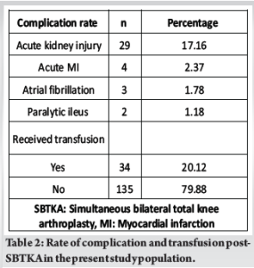 Data were retrospectively collected from existing health records of SBTKA patients. Patient demographic data such as age and comorbidities were collected. The presence of pre-operative comorbid conditions, including hypertension, diabetes mellitus, asthma, ischemic heart disease (IHD), chronic kidney disease (CKD), Parkinson’s disease (PD), and hypoparathyroidism was recorded. The perioperative assessment included the incidence of complications such as cardiac and renal dysfunction, rate of transfusion, and total length of stay (LOS).