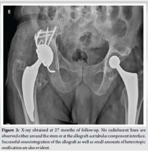 The post-operative course was uneventful and at the final 27 months of follow-up, the patient was free of pain and reported excellent patient-reported outcome measures (PROMs) (Harris Hip Score=93.85, Oxford Hip Score=41, Forgotten Joint Score=86.36, Patient Health Questionnaire-9=0, EQ-5D-5L=0.928, Pain Catastrophizing Scale=2, visual analogue scale=1). No radiolucent lines were observed around the stem as well as around the acetabular component. Moreover, the allograft osseointegration was classified as successful according to the Oswestry radiological classification system [22]. Small amounts of heterotopic ossification were developed in the right hip joint both at the lateral (Brooker 1) and medial side (type 3) [23,24] (Fig. 2).