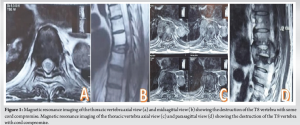 - MRI (May 2024): demonstrated metastasis at the T8 with cord compression (Fig. 1a and b), while MRI (November 2024): revealed continued deterioration at the T8 level (Fig. 1c and d).