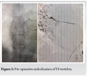 - Embolization: Pre-operative embolization of the T8 vertebra was performed to minimize bleeding and enhance the resection process (Fig. 2).