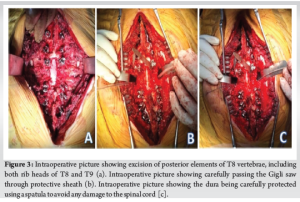 A Gigli saw was passed through the neural disc space to facilitate the excision of the affected vertebrae (Fig. 3b).